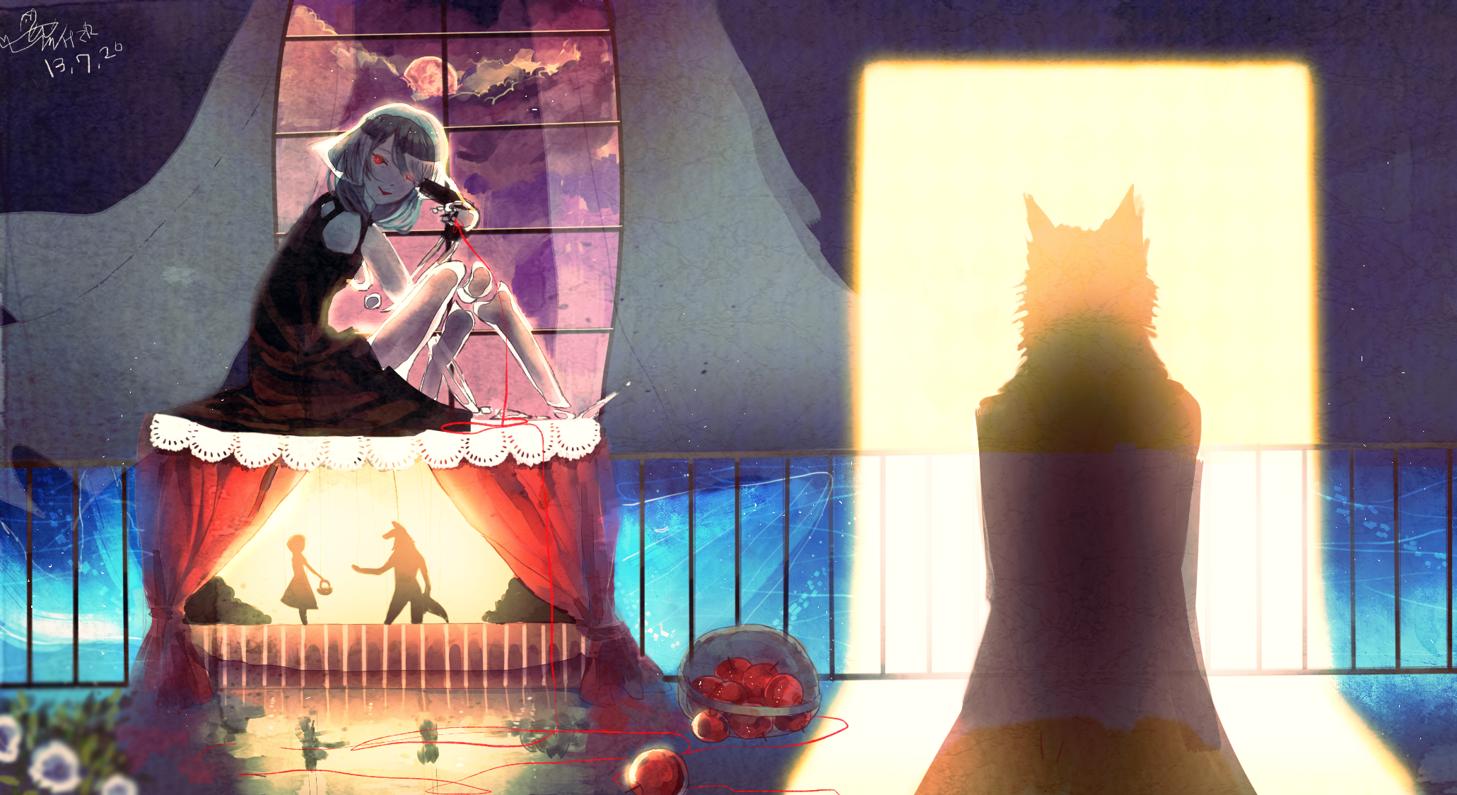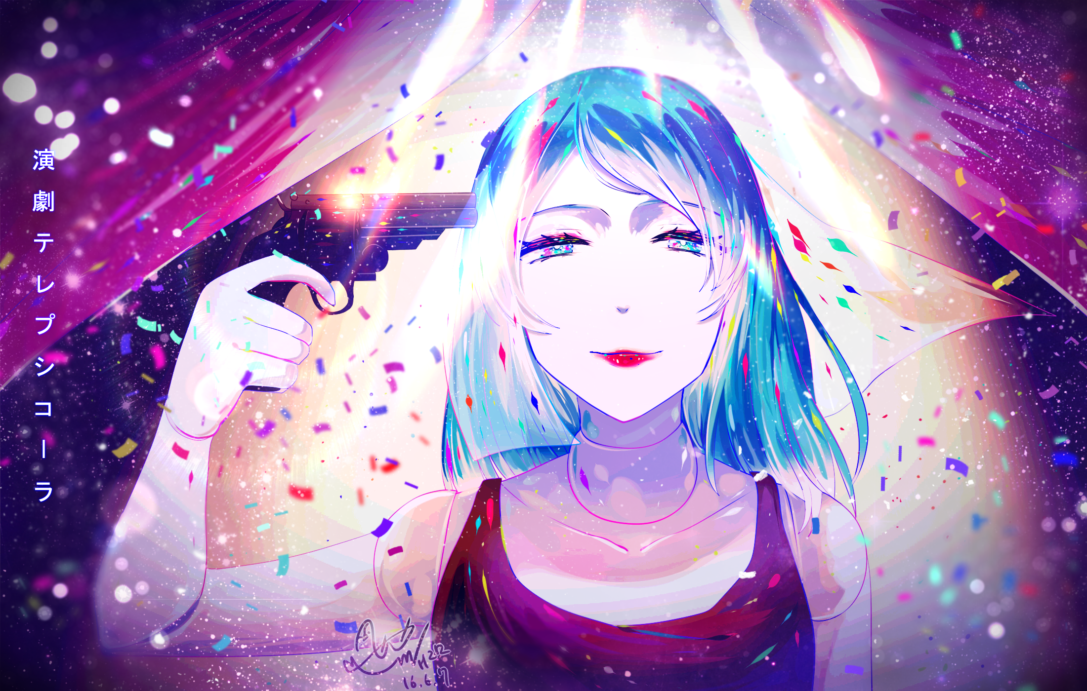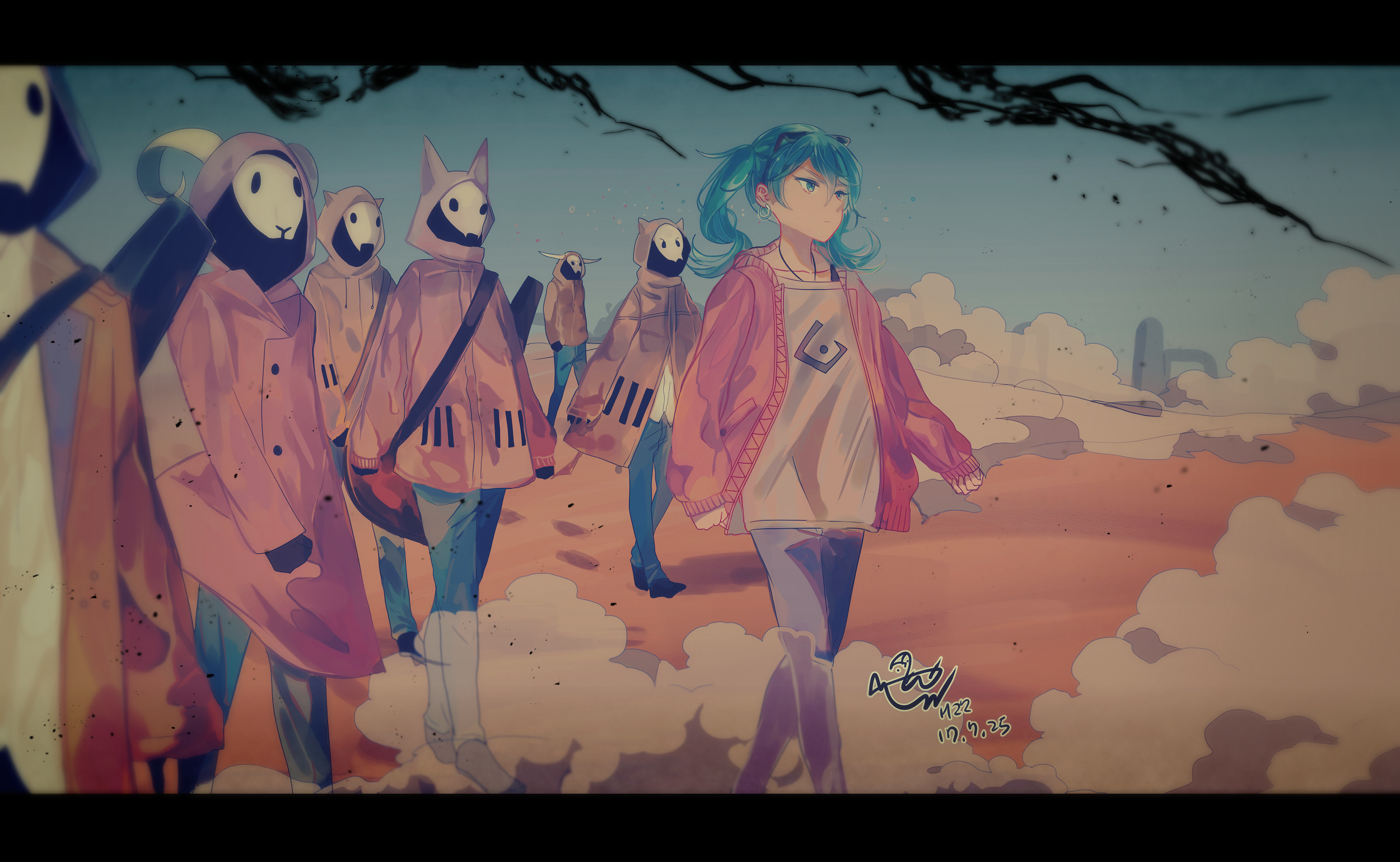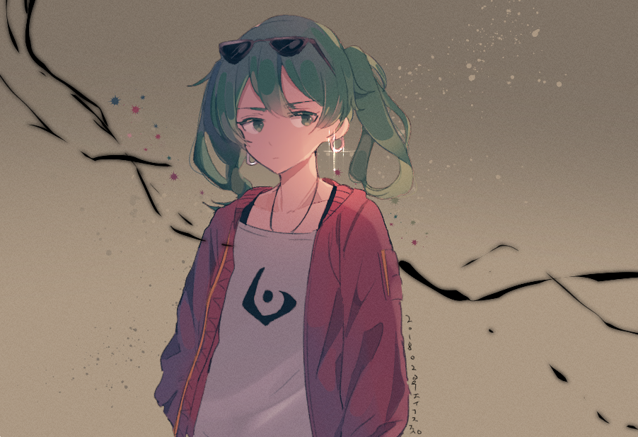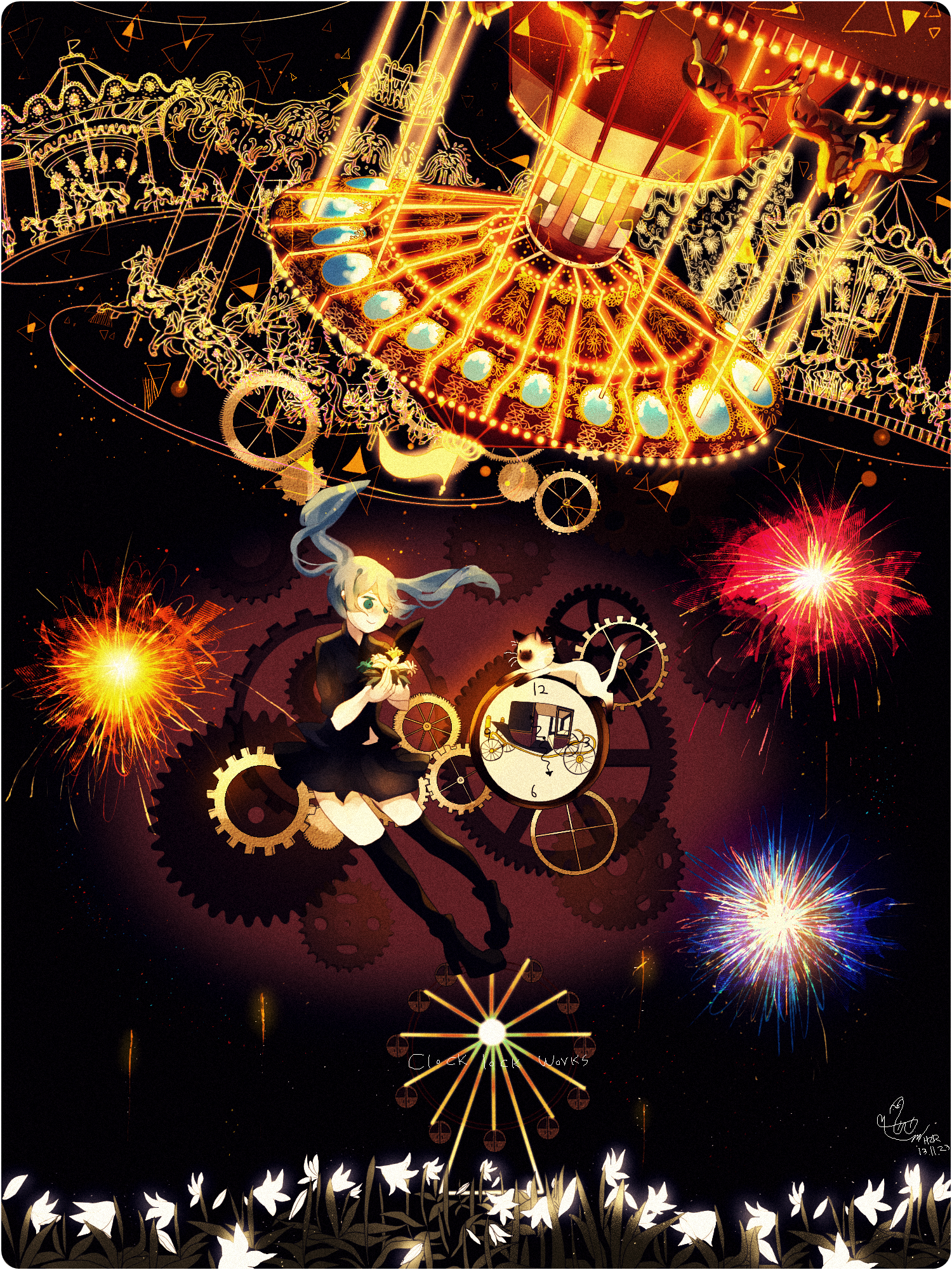 이번 2022년 clock lock works 일러는 회전목마도 관람차도 마차도 없고 대부분 주황색+노란색의 따뜻한 색감을 쓰다가 어두칙칙한 파란색에다가 일 걱정 없이 바다 구경을 간 미쿠를 그렸어요. 연차내고 여행이라도 떠난 느낌으로요.
